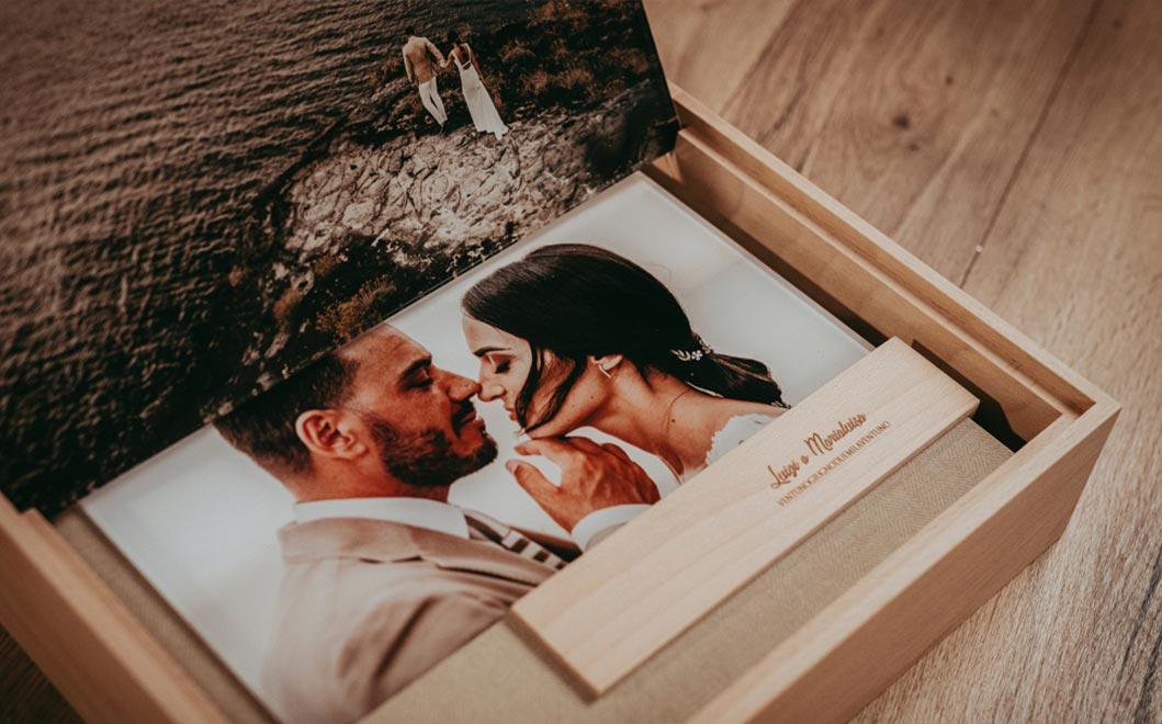 La possibilità di rivivere ogni volta che vorrete l'emozione del vostro giorno più importante attraverso una selezione di scatti scelti da voi stessi, dietro la costante guida del fotografo; scatti che vengono rielaborati, stampati e infine riuniti all'interno di un album creato su misura per voi.